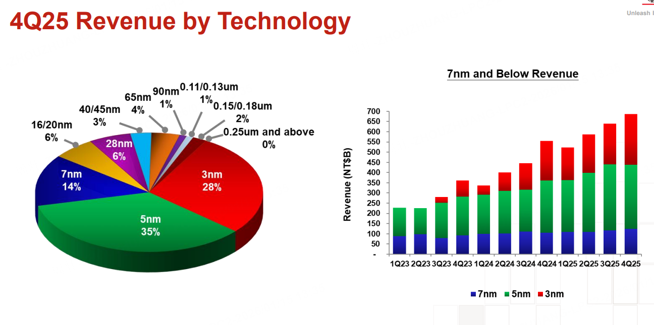 第四季度,3纳米晶圆出货量占晶圆总收入的28%;5纳米晶圆占35%;7纳米晶圆占14%。先进技术(定义为7纳米及更先进的技术)占晶圆总收入的77%。