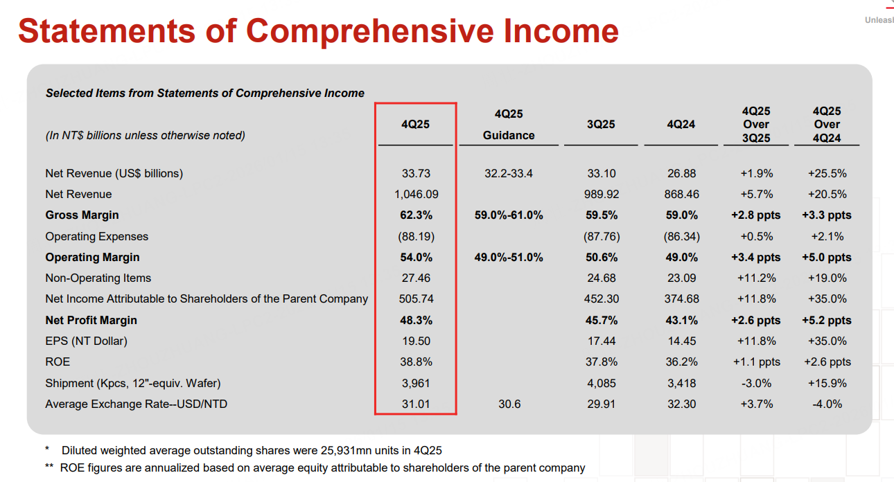 1月15日,台积电发布2025年第四季度业绩。财报显示,第四季度营收10460.9亿元台币,同比增长20.5%;第四季度净利润5057.4亿元台币,摊薄后每股收益19.5元台币,均同比增长35%;第四季度毛利率62.3%,市场预估60.6%。