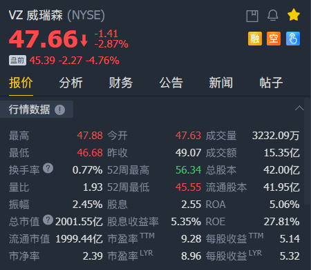 公布财报后,威瑞森盘前跌近5%。