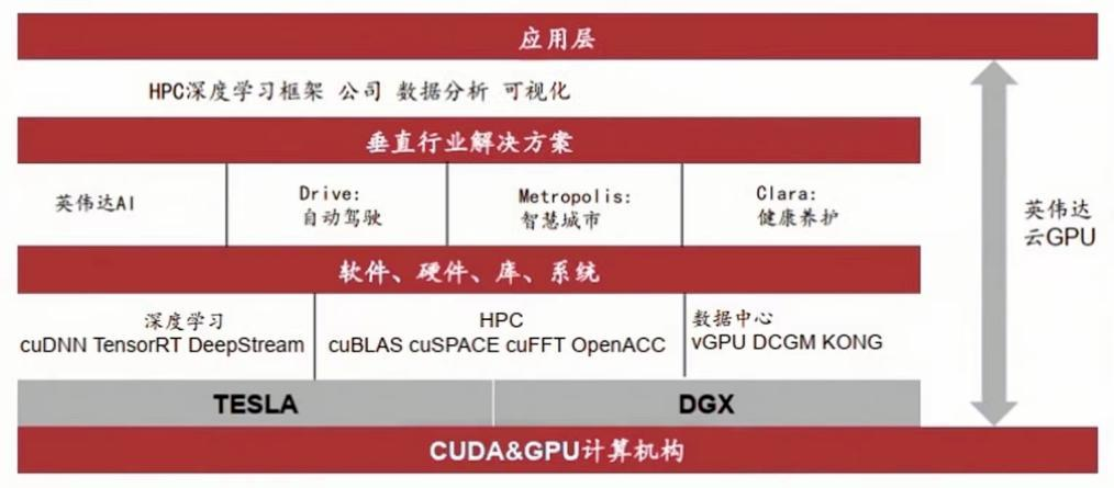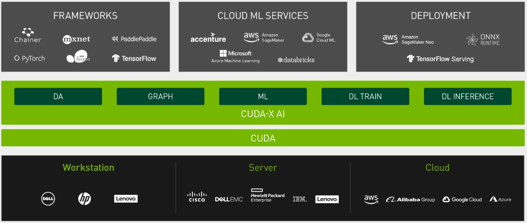 与此同时,英伟达仍在不断扩大CUDA生态,推出了软件加速库的集合CUDA-X AI。这些库建立在 CUDA之上,提供对于深度学习、机器学习和高性能计算必不可少的优化功能,是针对数据科学加速的端到端平台。
