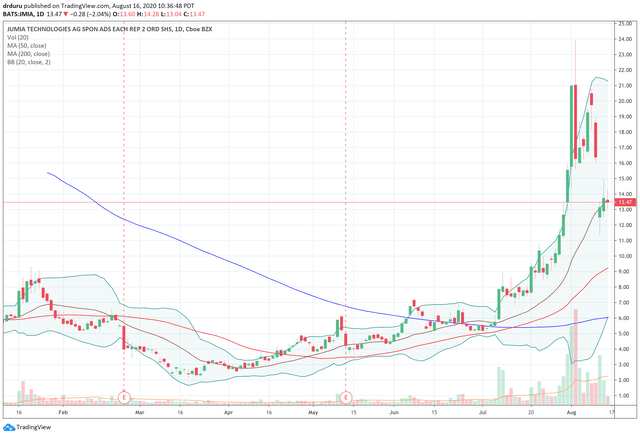 盈利消息并不坏,但也不足以支撑高企的股价。财报公布后,JMIA下跌20.0%。整个事件表明,价格和期权的行动只不过是猖獗投机的信号。抛物线移动往往结局不好。JMIA将其名字添加到列表中。