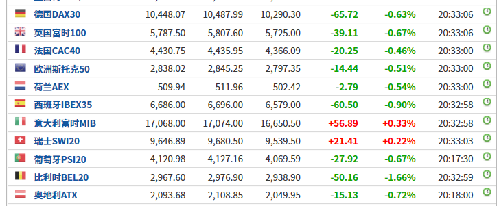 欧洲主要股指多数下跌,但跌幅较盘初有所收窄。德国DAX30指数跌0.63%,英国富100指数跌0.67%,法国CAC40指数跌0.46%。原油市场