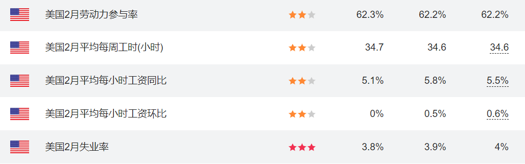 时薪涨幅不及预期,2月平均每小时工资同比增长5.1%,不及市场预期5.8%,前值为5.7%。劳动参与率小幅攀升,2月数据攀升至62.3%,好于市场预期的62.2%,前值为62.2%。