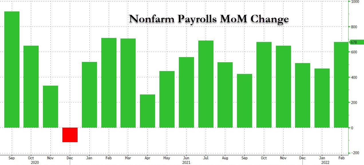 美国劳工统计局数据显示(企业调查),美国2月非农就业人口增加67.8万人,大幅好于市场预期的42.3万人,创2021年7月来最大增幅。2022年1月和2021年12月数据同时被上修,1月份非农新增就业人数从46.7万人上修至48.1万人;去年12月份非农新增就业人数从51万人上修至58.8万人。修正后,去年12月和今年1月的新增就业人数总和较此前报告的要高9.2万人。
