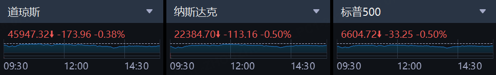 美东时间周四,三大股指连续第三个交易日集体下跌,此前公布的一系列政府数据和企业消息对经济前景释放出喜忧参半的信号。截至收盘,道琼斯指数跌0.38%,报45947.32点;标普500指数跌0.50%,报6604.72点;纳斯达克指数跌0.50%,报22384.70点。