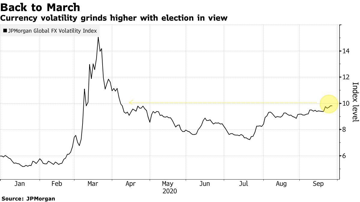外汇交易员一直对选举引发的动荡感到不安。自6月份以来,他们一直在利用日元来抵御市场波动。摩根大通基于三个月平价远期期权的20多种全球货币波动指数也回升至3月份以来的最高水平。