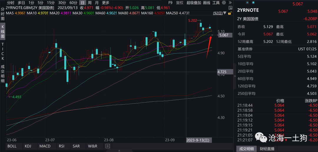 昨晚美股大幅调整,理论上,两年美债利率应该同步下行。奇怪的是,美股下跌的时候,两年美债没动,进入亚太交易时间,两年美债利率才大幅下行,来到了5.07%附近。