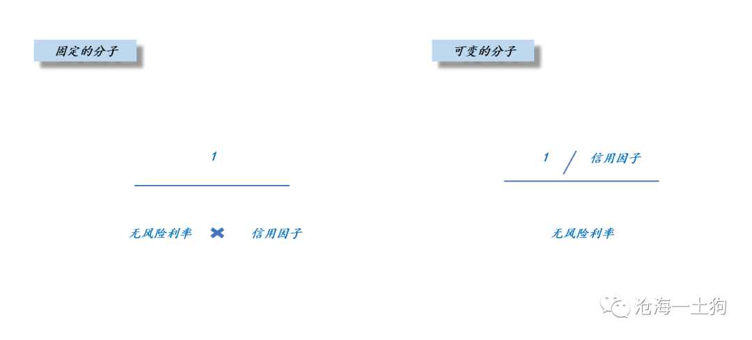 之所以我们容易混淆信用因子所带来的利率上行,是因为我们喜欢用固定分子的形式表达债券的价格。如果转换成可变分子的形式,情况就清晰了,无风险利率可能变动不大,但是,信用因子带来了巨大的波动。