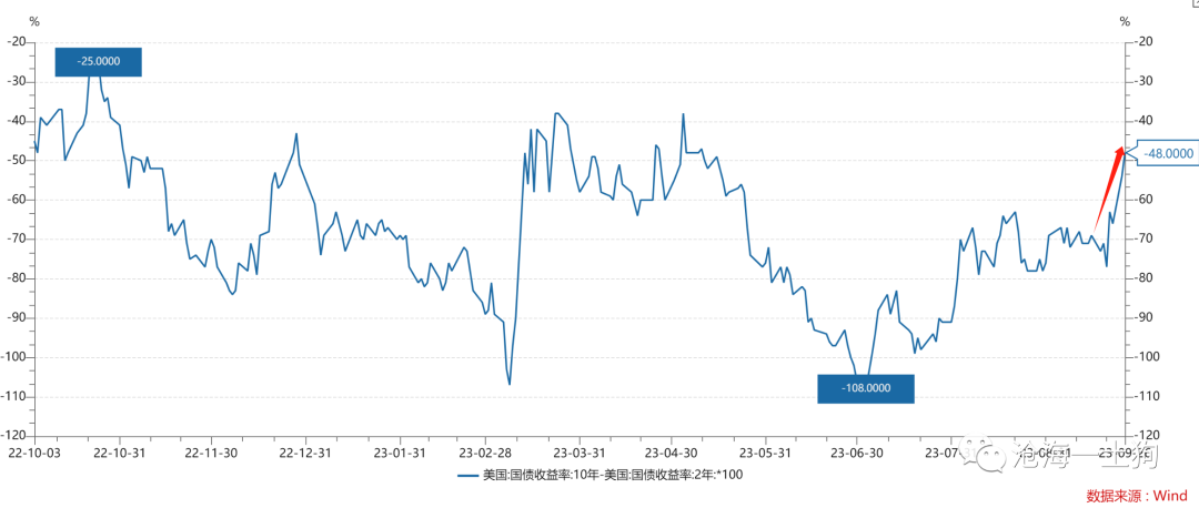 一方面,随着美国政府债务风险的增加,信用因子造成的影响扩大,十年美债利率上升。 另一方面,随着美国政府债务风险的增加,经济风险是加大的,因此,无风险利率应该下行,两年美债利率下行。