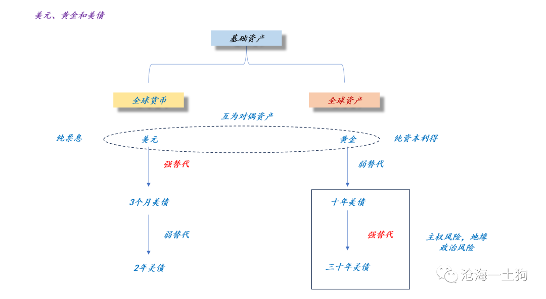 如上图所示,当美国政府债务问题开始作妖的时候,黄金代表无风险利率,3个月美债代表无风险利率,甚至2年美债也可以代表无风险利率,但是,美国长债要隐含信用因子。
