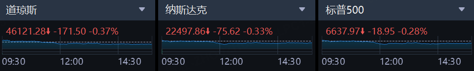 美东时间周三,三大指数集体收跌,人工智能(AI)龙头股英伟达和甲骨文连续第二天承压。截至收盘,道琼斯指数跌0.37%,报46121.28点;标普500指数跌0.28%,报6637.97点;纳斯达克指数跌0.33%,报22497.86点。
