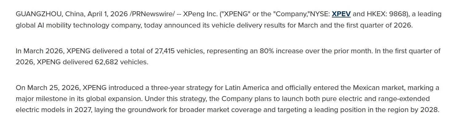 {"i18n":{"language":"zh_CN"},"isChannel":false,"data":{"share":"https://www.laohu8.com/m/news/1165441659?lang=zh_CN&edition=full","thumbnail":"https://static.tigerbbs.com/ccf08a65163213fb22b4f94f7fb404e8","is_english":false,"pubTime":"2026-04-01 16:40","share_image_url":"https://static.laohu8.com/e9f99090a1c2ed51c021029395664489","id":"1165441659","market":"us","top_or_hot":-1,"title":"小鹏汽车3月交付27,415辆,一季度累计交付62,682辆","media":"老虎资讯综合","content":"<html><head></head><body><p>4月1日,<a href=\"https://laohu8.com/S/XPEV\">小鹏汽车</a>2026年3月交付27,415辆汽车,环比增长80%。截至3月31日,一季度累计交付 62,682辆。</p><p class=\"t-img-caption\"><img src=\"https://static.tigerbbs.com/78ce6cd9d080eb3e26b122dea0d5bd25\" alt=\"\" title=\"\" tg-width=\"1465\" tg-height=\"392\"/></p><p><br/></p></body></html>","source":null,"html":"<!DOCTYPE html>\n<html>\n<head>\n<meta http-equiv=\"Content-Type\" content=\"text/html; charset=utf-8\" />\n<meta name=\"viewport\" content=\"width=device-width,initial-scale=1.0,minimum-scale=1.0,maximum-scale=1.0,user-scalable=no\"/>\n<meta name=\"format-detection\" content=\"telephone=no,email=no,address=no\" />\n<title>小鹏汽车3月交付27,415辆,一季度累计交付62,682辆</title>\n<style type=\"text/css\">\na,abbr,acronym,address,applet,article,aside,audio,b,big,blockquote,body,canvas,caption,center,cite,code,dd,del,details,dfn,div,dl,dt,\nem,embed,fieldset,figcaption,figure,footer,form,h1,h2,h3,h4,h5,h6,header,hgroup,html,i,iframe,img,ins,kbd,label,legend,li,mark,menu,nav,\nobject,ol,output,p,pre,q,ruby,s,samp,section,small,span,strike,strong,sub,summary,sup,table,tbody,td,tfoot,th,thead,time,tr,tt,u,ul,var,video{ font:inherit;margin:0;padding:0;vertical-align:baseline;border:0 }\nbody{ font-size:16px; line-height:1.5; color:#999; background:transparent; }\n.wrapper{ overflow:hidden;word-break:break-all;padding:10px; }\nh1,h2{ font-weight:normal; line-height:1.35; margin-bottom:.6em; }\nh3,h4,h5,h6{ line-height:1.35; margin-bottom:1em; }\nh1{ font-size:24px; }\nh2{ font-size:20px; }\nh3{ font-size:18px; }\nh4{ font-size:16px; }\nh5{ font-size:14px; }\nh6{ font-size:12px; }\np,ul,ol,blockquote,dl,table{ margin:1.2em 0; }\nul,ol{ margin-left:2em; }\nul{ list-style:disc; }\nol{ list-style:decimal; }\nli,li p{ margin:10px 0;}\nimg{ max-width:100%;display:block;margin:0 auto 1em; }\nblockquote{ color:#B5B2B1; border-left:3px solid #aaa; padding:1em; }\nstrong,b{font-weight:bold;}\nem,i{font-style:italic;}\ntable{ width:100%;border-collapse:collapse;border-spacing:1px;margin:1em 0;font-size:.9em; }\nth,td{ padding:5px;text-align:left;border:1px solid #aaa; }\nth{ font-weight:bold;background:#5d5d5d; }\n.symbol-link{font-weight:bold;}\n/* header{ border-bottom:1px solid #494756; } */\n.title{ margin:0 0 8px;line-height:1.3;color:#ddd; }\n.meta {color:#5e5c6d;font-size:13px;margin:0 0 .5em; }\na{text-decoration:none; color:#2a4b87;}\n.meta .head { display: inline-block; overflow: hidden}\n.head .h-thumb { width: 30px; height: 30px; margin: 0; padding: 0; border-radius: 50%; float: left;}\n.head .h-content { margin: 0; padding: 0 0 0 9px; float: left;}\n.head .h-name {font-size: 13px; color: #eee; margin: 0;}\n.head .h-time {font-size: 11px; color: #7E829C; margin: 0;line-height: 11px;}\n.small {font-size: 12.5px; display: inline-block; transform: scale(0.9); -webkit-transform: scale(0.9); transform-origin: left; -webkit-transform-origin: left;}\n.smaller {font-size: 12.5px; display: inline-block; transform: scale(0.8); -webkit-transform: scale(0.8); transform-origin: left; -webkit-transform-origin: left;}\n.bt-text {font-size: 12px;margin: 1.5em 0 0 0}\n.bt-text p {margin: 0}\n</style>\n</head>\n<body>\n<div class=\"wrapper\">\n<header>\n<h2 class=\"title\">\n小鹏汽车3月交付27,415辆,一季度累计交付62,682辆\n</h2>\n\n<h4 class=\"meta\">\n\n\n<a class=\"head\" href=\"https://laohu8.com/wemedia/102\">\n\n\n<div class=\"h-thumb\" style=\"background-image:url(https://static.tigerbbs.com/8274c5b9d4c2852bfb1c4d6ce16c68ba);background-size:cover;\"></div>\n\n<div class=\"h-content\">\n<p class=\"h-name\">老虎资讯综合 </p>\n<p class=\"h-time\">2026-04-01 16:40</p>\n</div>\n\n</a>\n\n\n</h4>\n\n</header>\n<article>\n<html><head></head><body><p>4月1日,<a href=\"https://laohu8.com/S/XPEV\">小鹏汽车</a>2026年3月交付27,415辆汽车,环比增长80%。截至3月31日,一季度累计交付 62,682辆。</p><p class=\"t-img-caption\"><img src=\"https://static.tigerbbs.com/78ce6cd9d080eb3e26b122dea0d5bd25\" alt=\"\" title=\"\" tg-width=\"1465\" tg-height=\"392\"/></p><p><br/></p></body></html>\n\n</article>\n</div>\n</body>\n</html>\n","isBrief":false,"type":0,"news_type":1,"symbol":"BK4526","symbol_name":"热门中概股","start_time":0,"source_url":"","article_id":"1165441659","we_media_id":"102","thumbnails":["https://static.tigerbbs.com/ccf08a65163213fb22b4f94f7fb404e8"],"rights":null,"url":"https://stock-news.laohu8.com/highlight/detail?id=1165441659","pubTimestamp":1775032807,"columns":[],"sourceInfo":null,"weMediaInfo":{"media_name":"老虎资讯综合","introduction":"为用户提供金融资讯、行情、数据,旨在帮助投资者理解世界,做投资决策。","home_visible":1,"id":"102","head_image":"https://static.tigerbbs.com/8274c5b9d4c2852bfb1c4d6ce16c68ba"},"summary":"小鹏汽车2026年3月交付27,415辆汽车,环比增长80%。截至3月31日,一季度累计交付 62,682辆。","collect":0,"end_time":0,"defaultTopTitle":"","property":[],"viewcount":null,"language":"zh","relate_stocks":{"BK4526":"热门中概股","BK1610":"ETF&股票定投概念","BK1587":"次新股","XPEG":"2倍做多XPEV ETF-Leverage Shares","BK4505":"高瓴资本持仓","EVS.SI":"MSCI China Electric Vehicles and Future Mobility ETF-NikkoAM","BK1119":"汽车制造商","LU0593848301.USD":"未来资产亚洲卓越消费股票基金A","XPEV":"小鹏集团","BK4555":"新能源车","BK1575":"同股不
