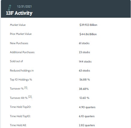 在前五大重仓股中,能源股Cheniere Energy(CQP.US)位列第一,持仓约2.04亿股,持仓市值约86亿美元,占投资组合比例为21.56%。
