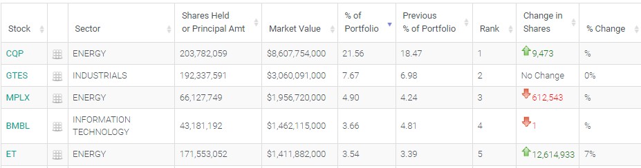 Energy Transfer(ET.US)位列第五,持仓约1.71亿股,持仓市值约14.12亿美元,较上季度持仓数量增加了7%,占投资组合比例为3.54%。