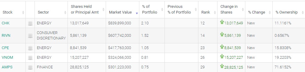 从持仓比例变化来看,前五大买入标的分别是:Cheniere Energy、第一能源(FE.US)、切萨皮克能源(CHK.US)、Rivian automative(RIVN.US)、卡隆石油(CPE.US)。