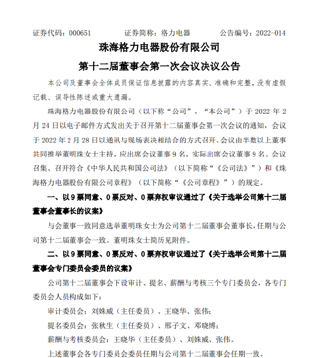 2月28日,格力电器2022年第一次临时股东大会召开,董事会换届选举议案顺利通过。董明珠、张伟、邓晓博、张军督、郭书战当选为新一届非独立董事,刘姝威、邢子文、王晓华、张秋生当选为独立董事。