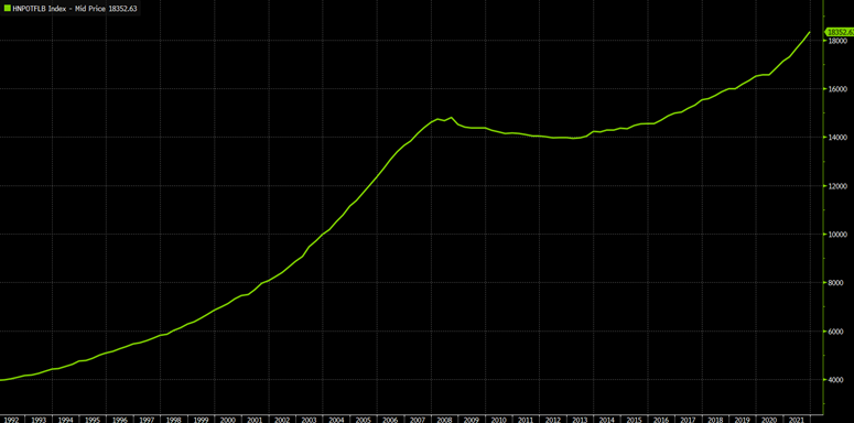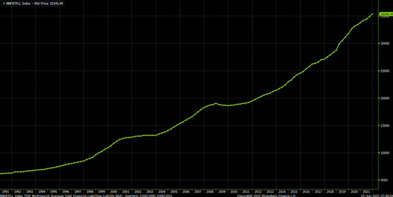 下图是美国的家庭/非盈利性组织的债务,在2008年回落之后,现在又进入了快速上升通道,特别是2020年新冠之后,上升速度更快。