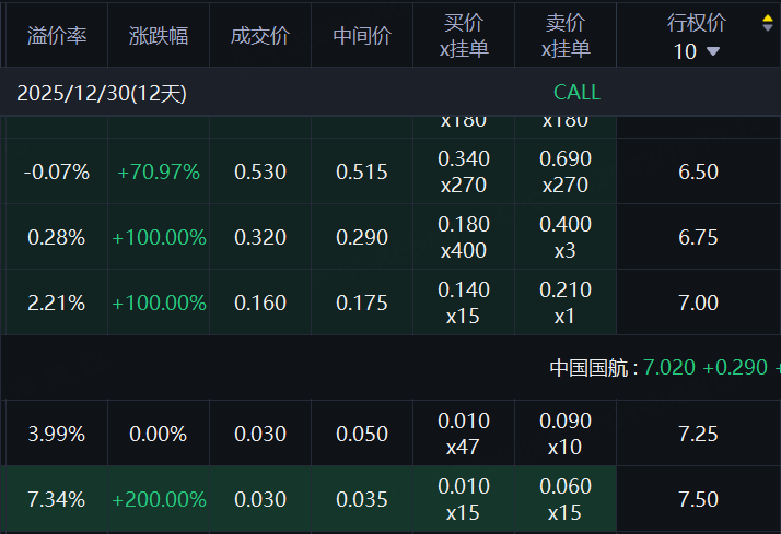 期权方面,中国国航的CALL单涨幅也较为突出。一张行权价7.5港元的CALL,涨幅达200%。