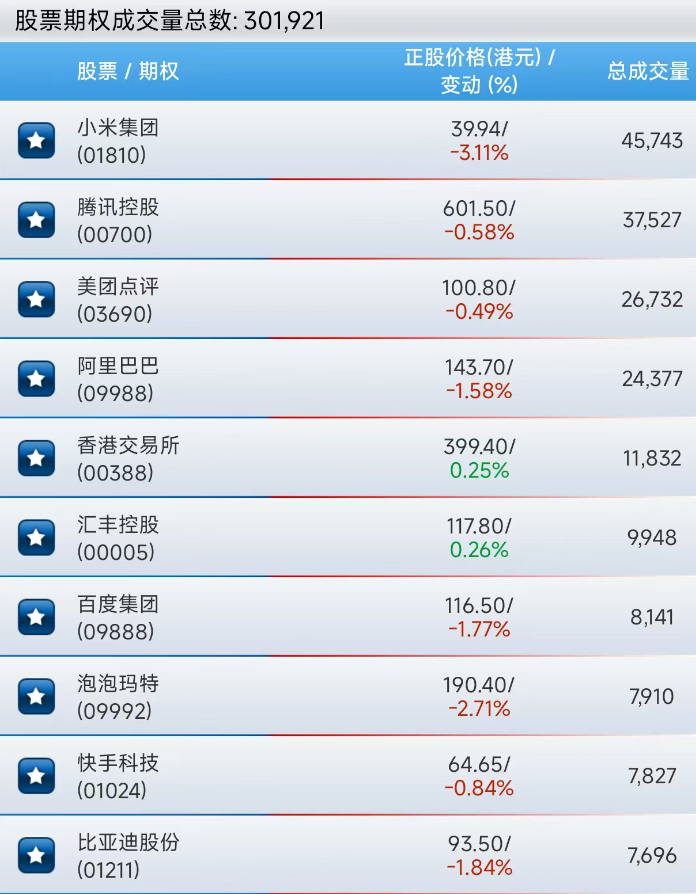 港股股票期权成交量半日成交301921张合约。小米集团成交量居首,腾讯、美团、阿里紧随其后。