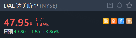截至发稿,达美航空盘前涨近4%。