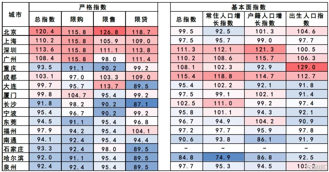 由于各城市首付比下限及非普住宅首付比的调整幅度或仍将视自身情况而定,前期房地产量价越弱的城市,调整幅度或越大。而前期房贷政策限制较严、人口基本面较好的城市,楼市政策调整后潜在反弹空间可能相对大一些。我们初步估算的打分表显示,北京、上海、深圳、广州、成都、福州等城市住房政策限制较严,而深圳、广州、重庆、成都、长沙人口增长状况较好。