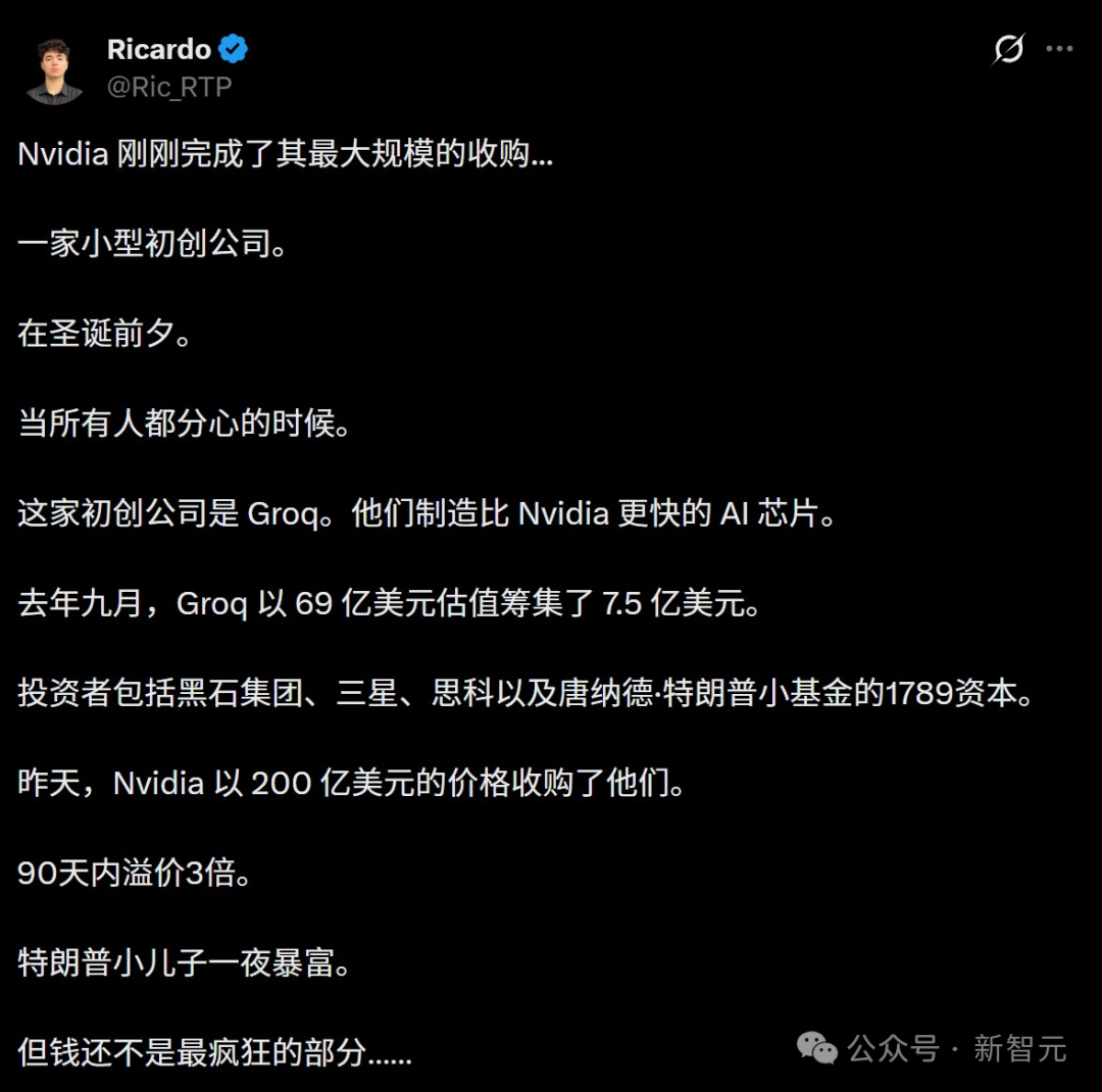 它以200亿美元天价,拿下了AI芯片初创公司Groq。这一价格,是Groq三个月前估值的3倍。