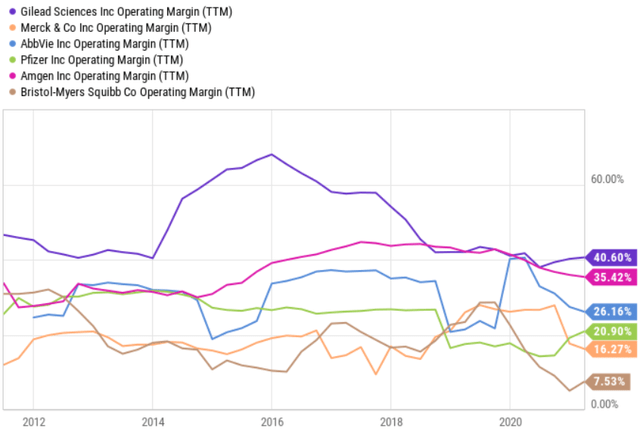 One of the reasons for why I’m bullish around GILD is that the enterprise remains a cash cow, as supported by its high margins. Over the past decade, GILD’s operating margin has stayed above the 40% mark for virtually the entire time. This speaks to the mission-critical nature of its treatments and the pricing power that GILD has held over this time period. As seen below, GILD’s op margin sits above that of its U.S. peers Merck (MRK), AbbVie (ABBV), Pfizer (PFE), Amgen (AMGN), and Bristol-Myers Squibb (BMY).