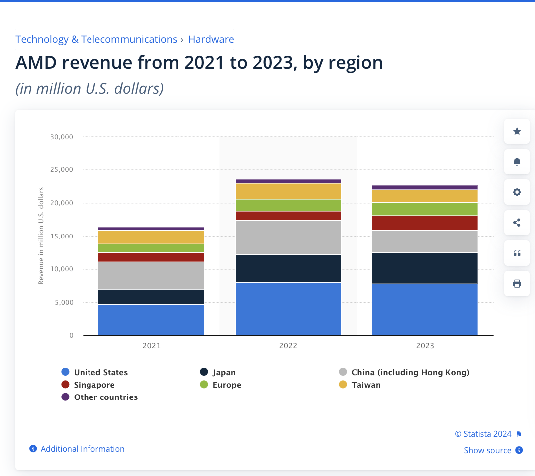 在分析师看来,AMD 的股价似乎已经反映了很多坏消息,盈利方面仍有出现惊喜的空间。首先,阿斯麦和 AMD 之间存在很大差异。前者更依赖国外客户,而 AMD 的收入在地域分布上更均匀。
