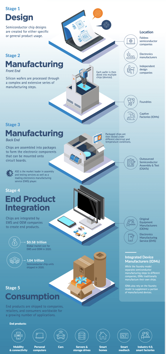 AMD 和英伟达 一样,都是芯片设计公司。他们主要负责设计用于制造半导体的技术。另一方面,我们有台积电,这是一家组装芯片的晶圆厂公司。处于中间位置的阿斯麦,它销售制造上述芯片所需的设备,专注于光刻技术。