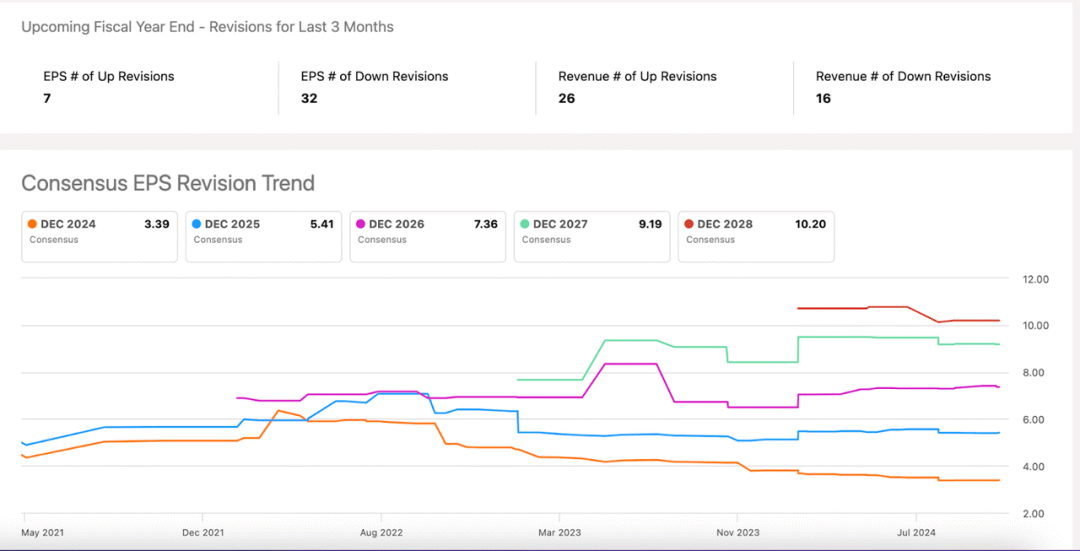 我们还可以看到,过去三个月 EPS 的下调幅度远大于上调幅度。有趣的是,收入似乎恰恰相反。