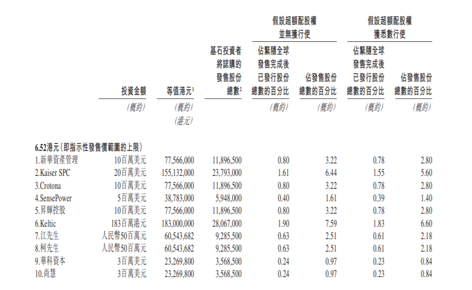 基石投资者方面,公司已就基石配售与新华资产管理(香港)有限公司、Kaiser Private Equity Fund SPC-SPI、Crotona Assets Limited 、 SensePower Management Limited、升辉控股有限公司、 Keltic Investment (HK) Limited、江淦钧先生、柯建生先生、华科资本有限公司、 及尚慧企业有限公司订立基石投资协议。