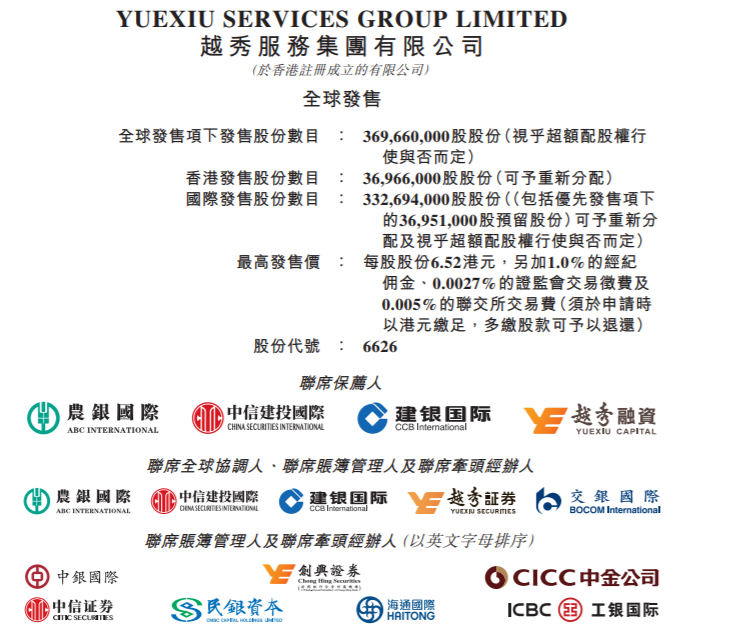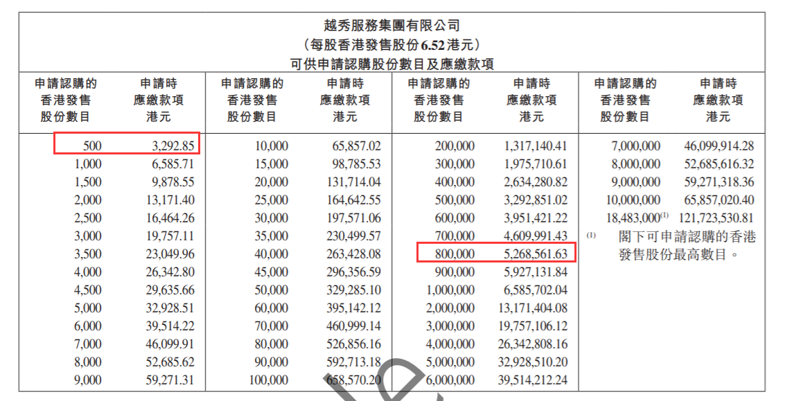 6月16日消息,本周三越秀服务发布公告,将于6月16日-21日招股,公司拟发行约3.7亿股股份,其中公开发售约3696.6万股股份,国际发售约3.33亿股,每股发行价4.88-6.52港元,每手500股,预计于6月28日上市。申购阶梯: