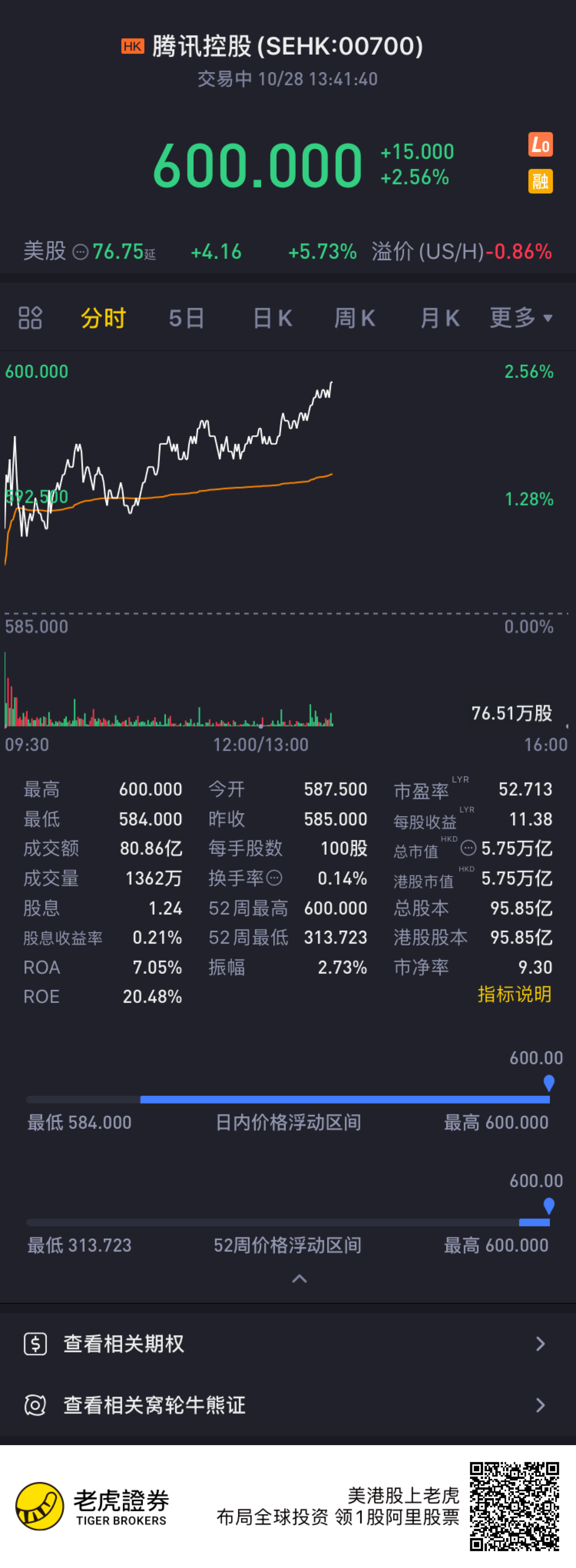 腾讯控股股价首次突破600港元关口,现涨2.56%