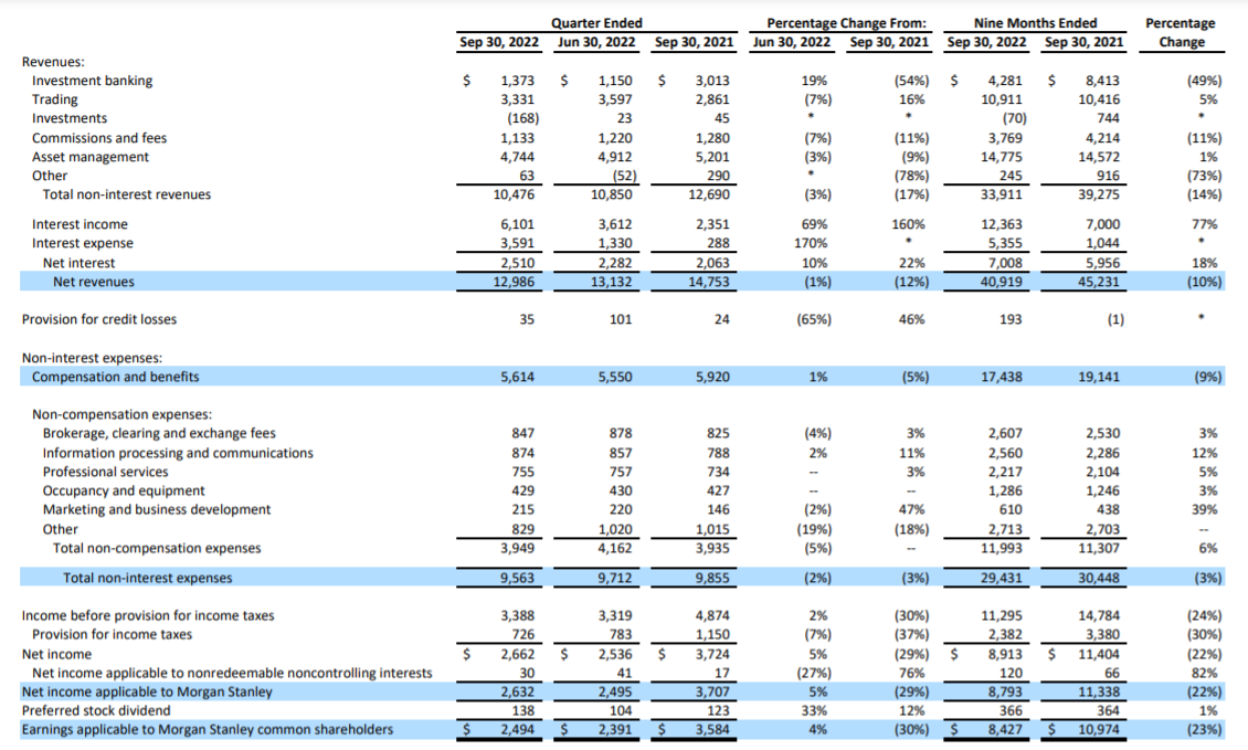 摩根士丹利CEO戈尔曼:虽然投资银行和投资管理业务受到市场环境的影响,但固定收益和股票业务在充满挑战的市场中表现良好。作为股票回购计划的一部分,第三季度回购了26亿美元的股票。