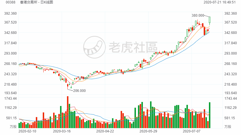 7月21日,香港交易所大涨9.83%,收于380港元历史高点!同时,阿里巴巴涨逾7%,腾讯涨近8%,美团点评涨逾8%,小米集团涨近5%。