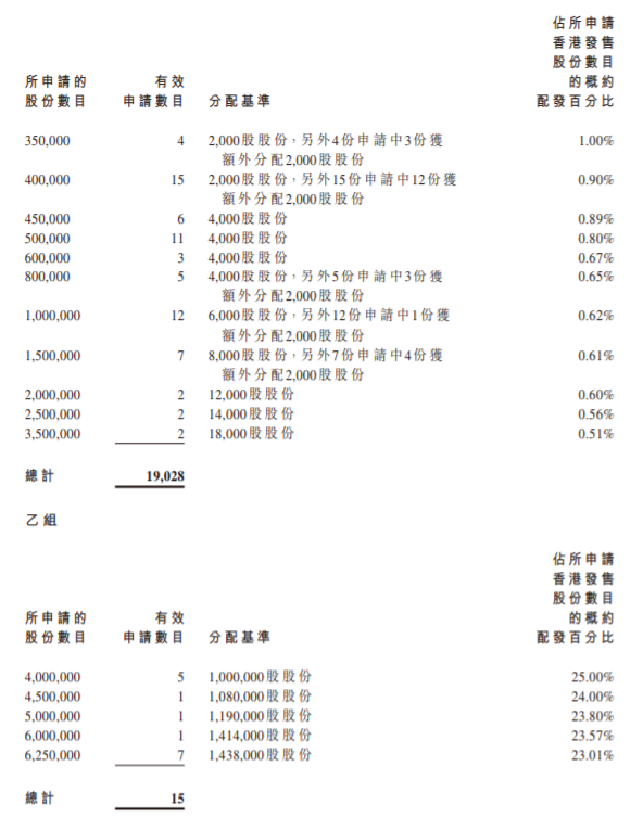 乙组头为400万股,申购所需资金约5,454,415.80港元。获配100万股(500手)。