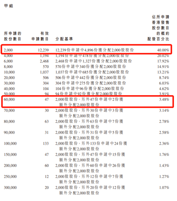 甲组每手2000股,入场费约2,727.21港元。一手中签率40%,认购30手稳中一手。