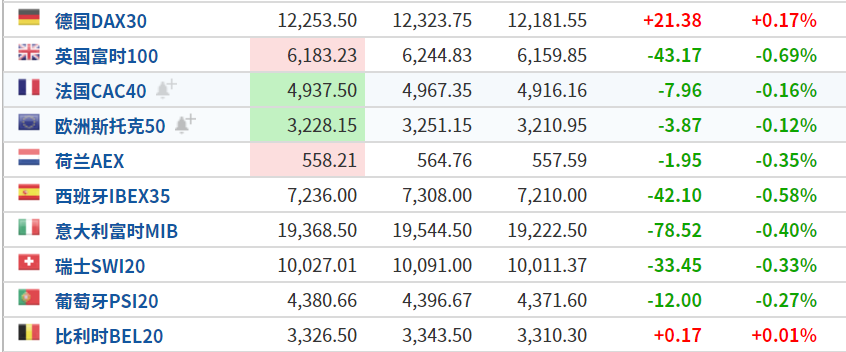 欧洲股市涨跌不一,截止发稿时间,英国富时100指数跌0.69%,法国CAC40指数跌0.16%,德国DAX指数涨0.17%。