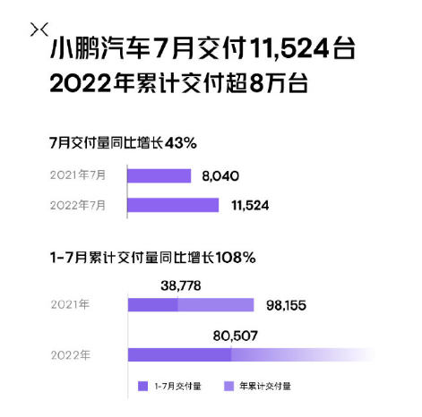 小鹏汽车7月总交付11524台,同比增长43%。 截至2022年7月,小鹏汽车累计交付超8万台,为去年同期的2.1倍;历史累计交付量已接近22万台。