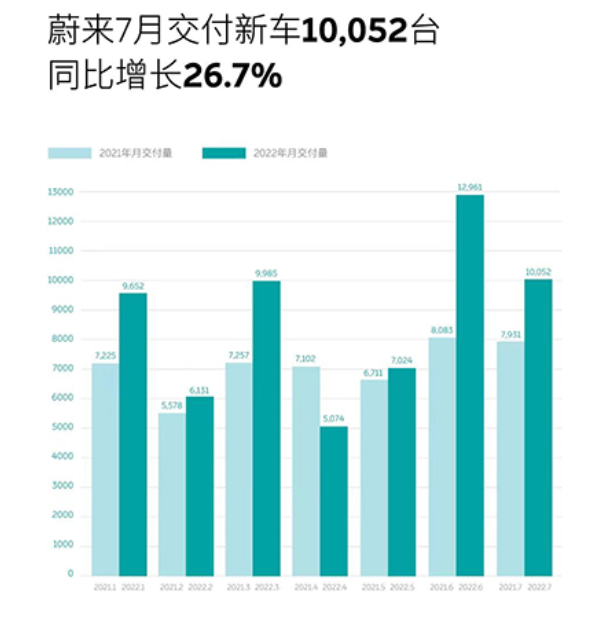 蔚来7月汽车交付量为10052辆汽车,同比增长26.7%;截至2022年7月31日蔚来汽车累计交付量达到227949辆。