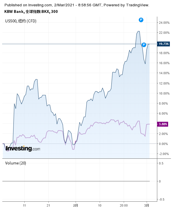 今年以来,美国十年期国债收益率已经从0.9%跳升至约1.4%,上周一度触及1.61%的一年高位;KBW银行指数同期上涨了近20%,而标普500指数的涨幅不到4%。