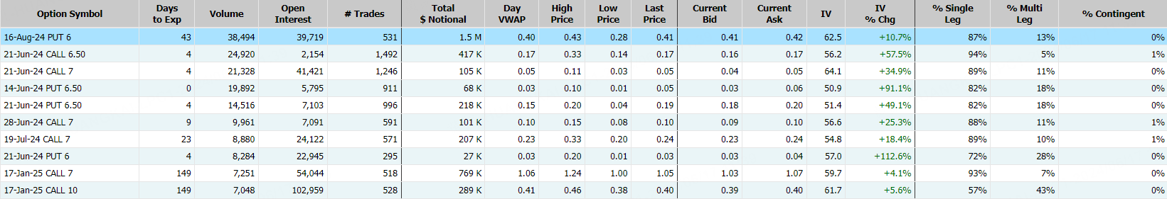 上周五,因第四大股东清仓其股票,SOFI收跌5%,期权合约成交36.97万张。较90日均量放大1.7倍。8月16日到期的6美元的行权看跌期权交易量特别高,共有38,494份合约交易。SOFI 20240816 6.0 PUT