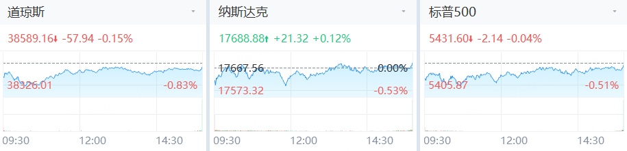 上周五(6月14日),美股三大指数涨跌不一,纳斯达克综合指数涨0.12%,报17,688.88点,连续第五个交易日收创新高,一周累涨3.24%。标普500指数跌0.04%,报5,431.60点,终结日线四连涨,但一周累涨1.58%;道琼斯指数跌0.15%,报38,589.16点,连续四日下跌,一周累跌0.54%。