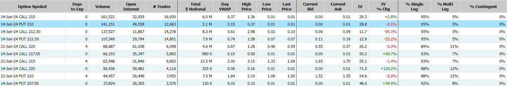 上周五,苹果跌近1%,“全球第一市值”的宝座仅一天就归还给了微软。期权合约成交188.27万张。当日到期的210美元的行权看跌期权交易量特别高,共有141,151份合约交易。