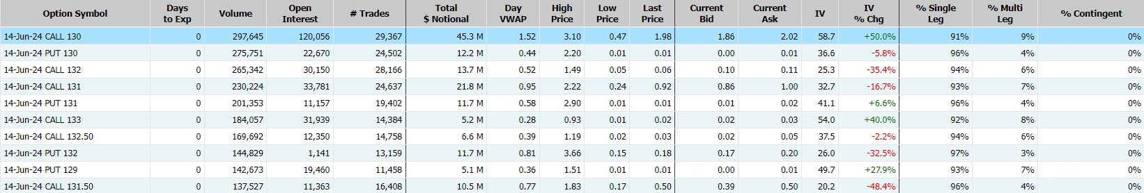 上周五,英伟达上涨1.75%,股价续刷新高。期权合约成交796.12万张。较90日均量放大4.6倍。当日到期的130美元的行权看涨期权交易量特别高,共有297,645份合约交易。