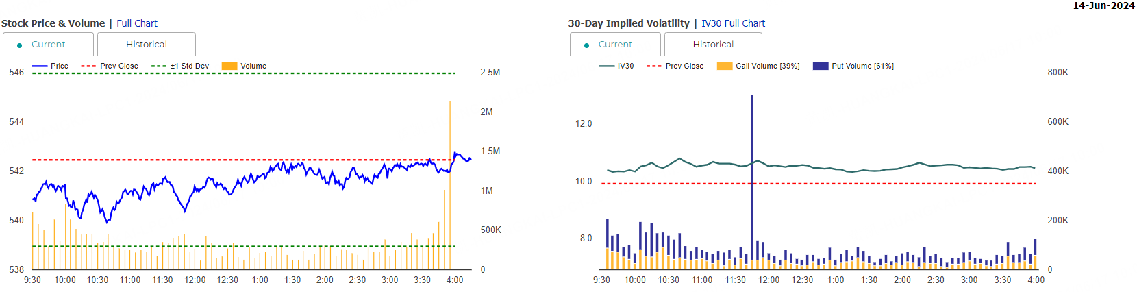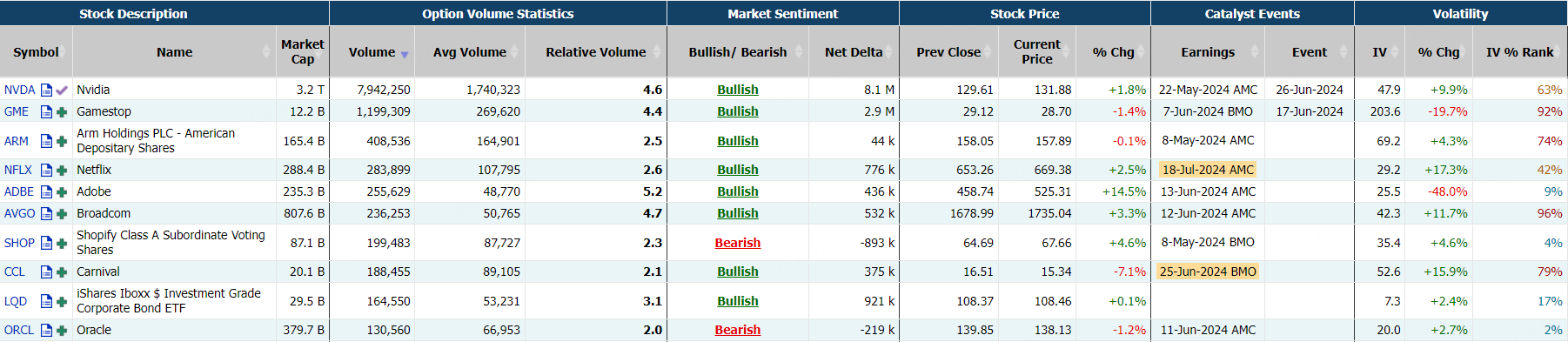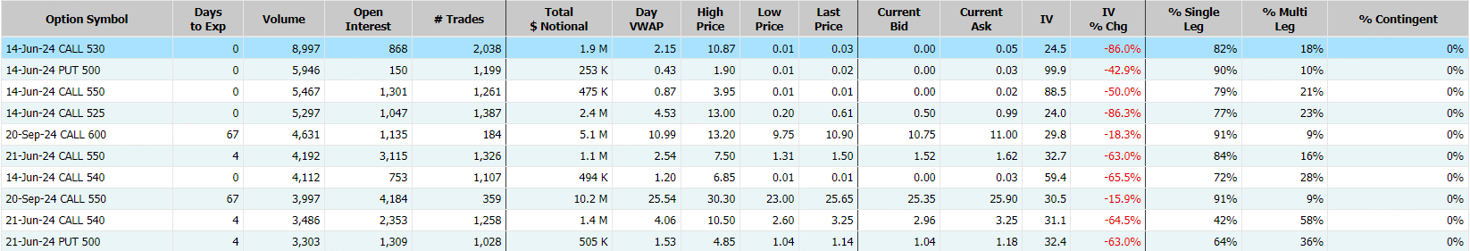 上周五,Adobe涨超14%,期权合约成交25.56万张。较90日均量放大5.2倍。当日到期的530美元的行权看涨期权交易量特别高,共有8,997份合约交易。