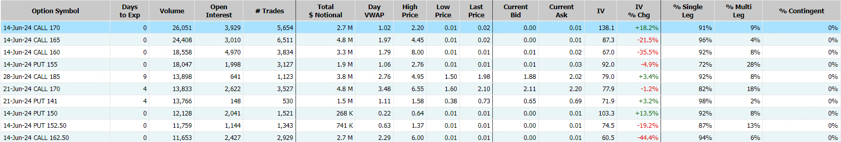 上周五,Arm股价一度大涨6%创历史新高,但随后转跌。期权合约成交40.85万张。较90日均量放大2.5倍。当日到期的170美元的行权看涨期权交易量特别高,共有26,051份合约交易。