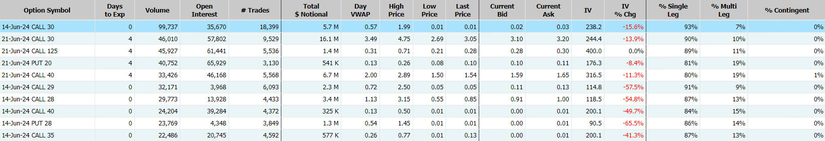 上周五,游戏驿站跌1.44%,期权合约成交120.84万张。较90日均量放大4.4倍。当日到期的30美元的行权看涨期权交易量特别高,共有99,737份合约交易。
