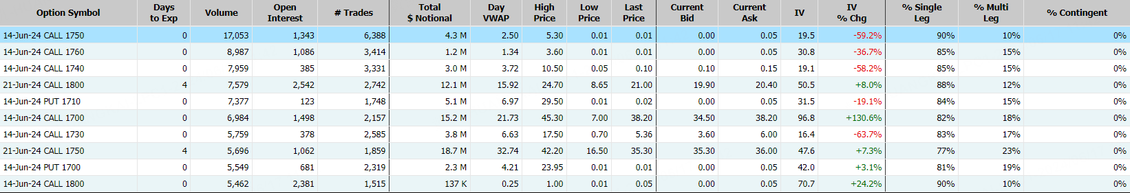 上周五,博通收高3.34%,再创历史新高。期权合约成交23.62万张。较90日均量放大4.7倍。当日到期的1750美元的行权看涨期权交易量特别高,共有17,053份合约交易。