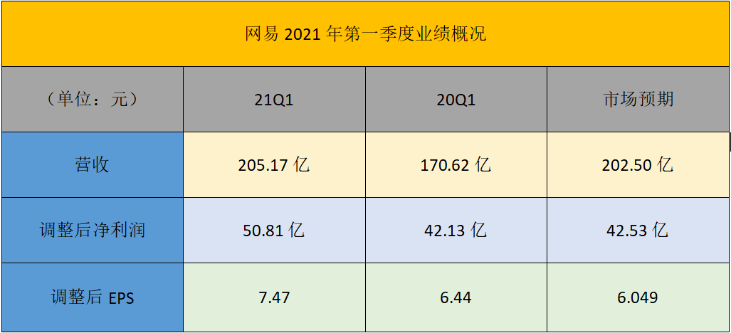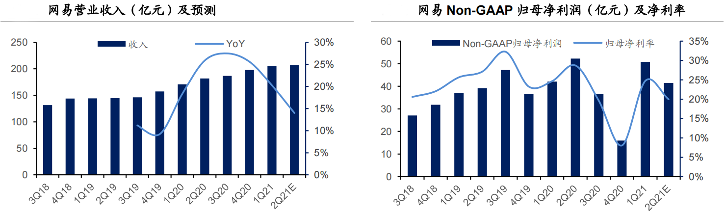 网易2021年第一季度业绩超预期。财报显示,网易Q1营收205亿元,同比增加20.2%;属于公司股东的净利润为44亿元,同比增加25.0%。其中,在线游戏服务净收入150亿元,同比增加10.8%;有道净收入13亿元,同比增加147.5%;网易创新与其他业务净收入42亿元,同比增加39.7%。